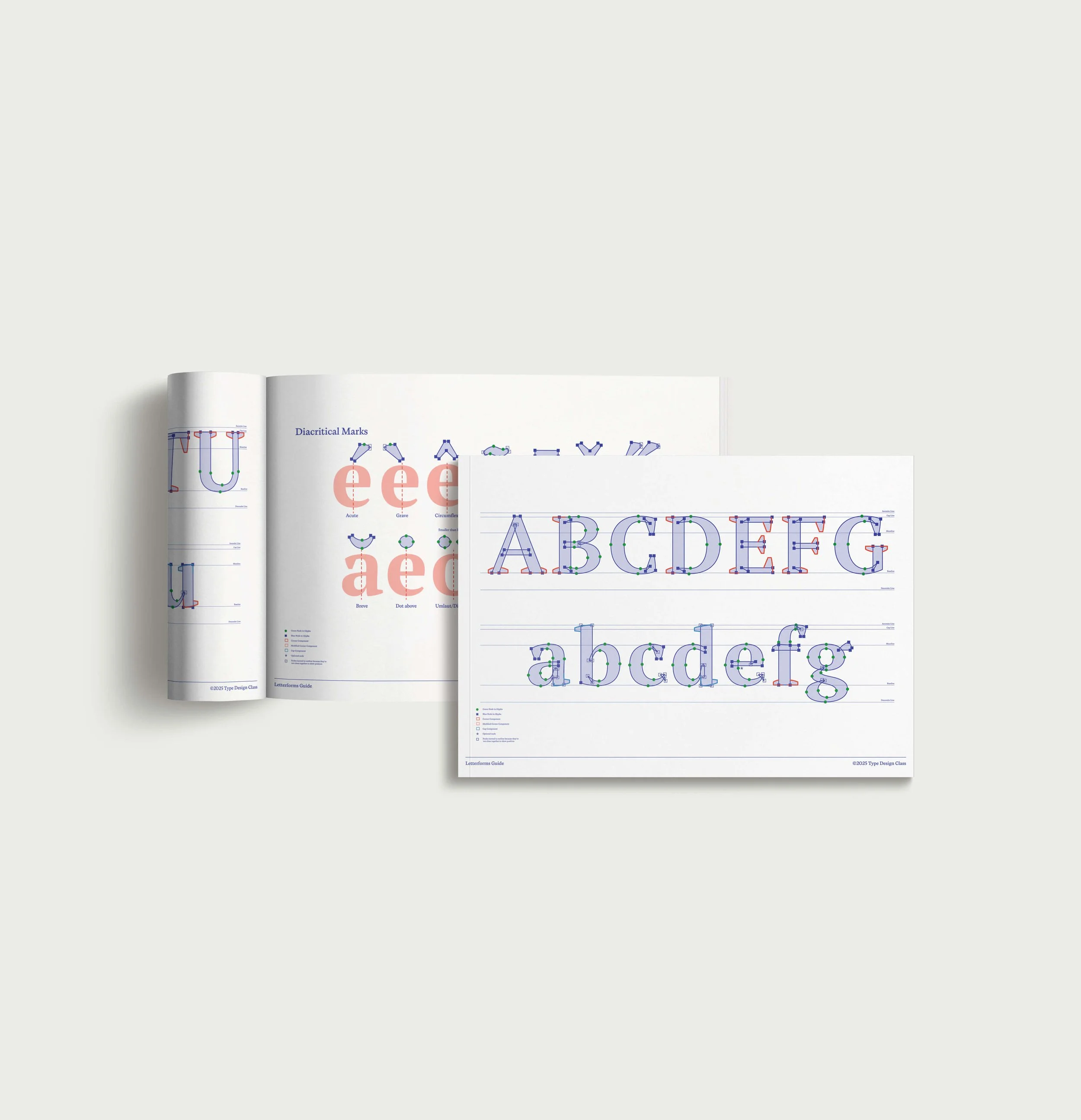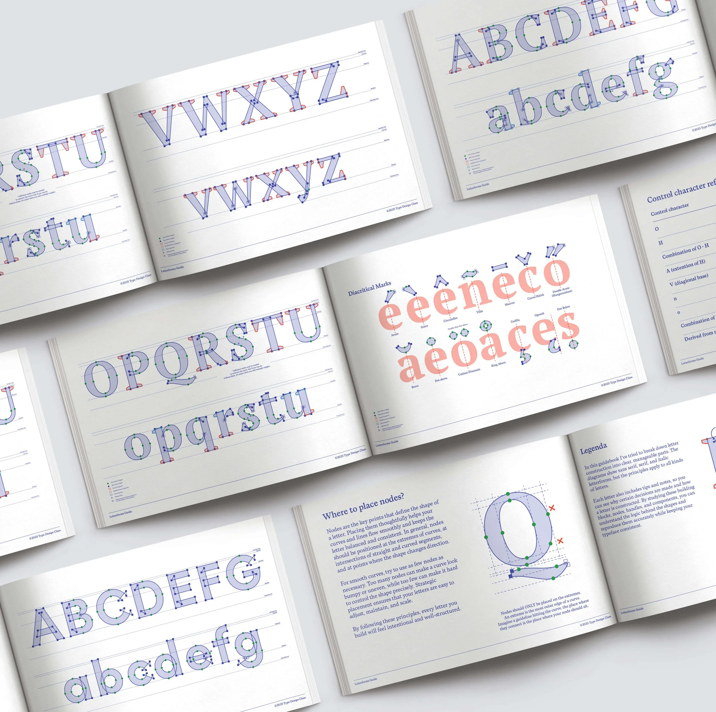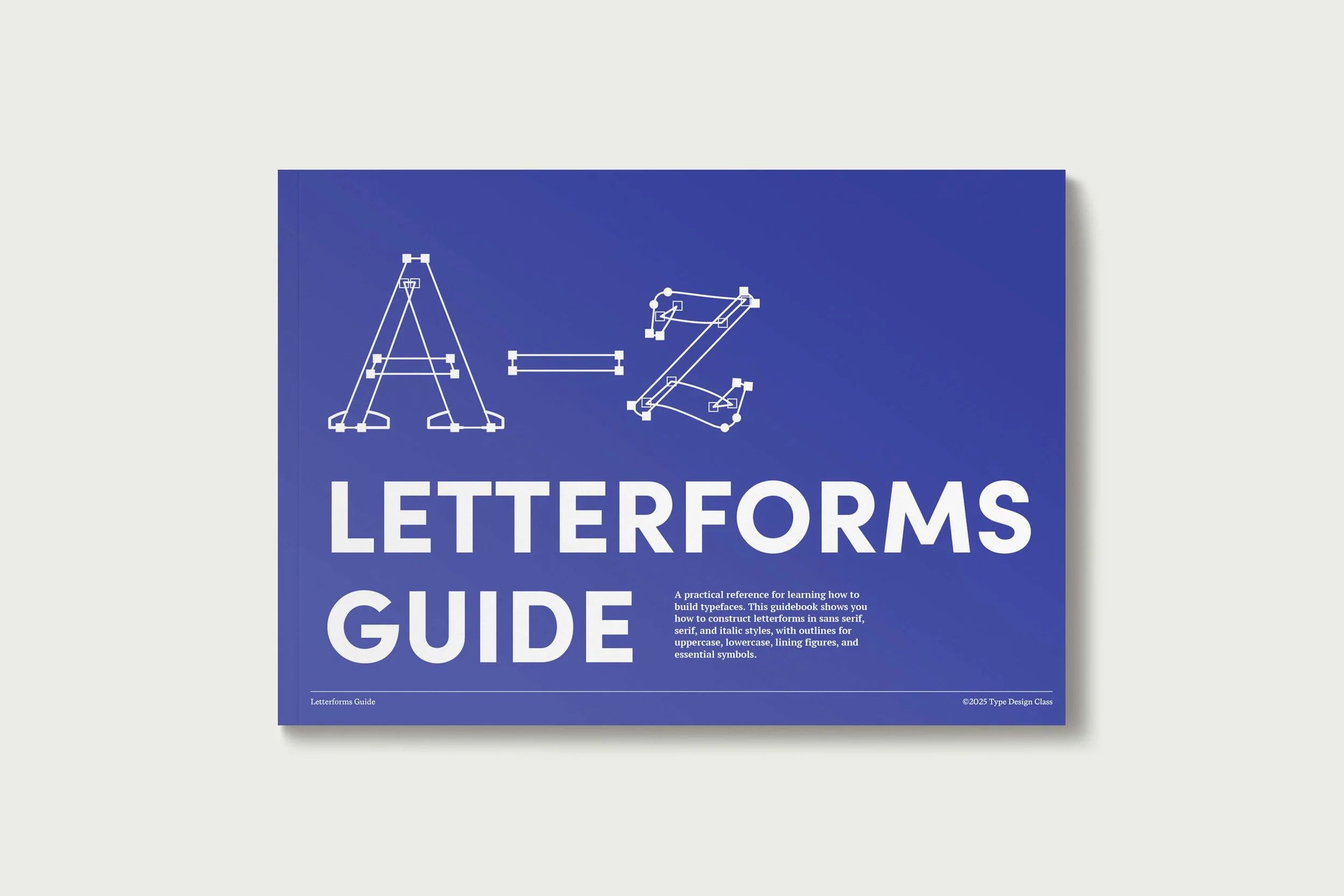 The Letterforms Guide is made for students and beginning type designers who want to understand how letterforms are built, not just drawn. It covers the complete Latin alphabet in sans serif, serif, and italic styles, showing every outline, node, and component used in professional font construction.